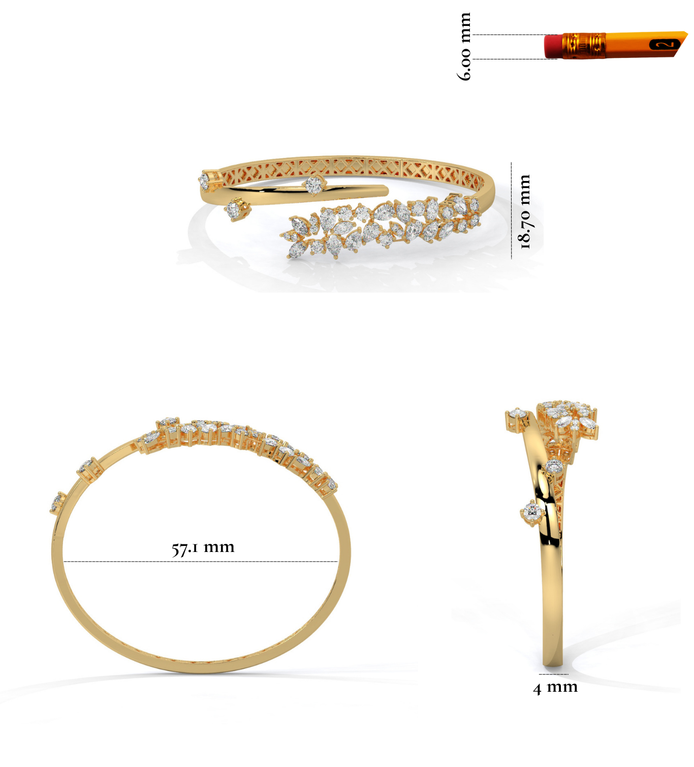 Crafted in radiant 10KT, 14KT, 18KT Gold & Sterling Silver, the design wraps gently around the wrist, offering a perfect harmony of fluid form and sparkling elegance. The intricate craftsmanship and natural motif make it an ideal piece for both special occasions and elevated everyday wear.