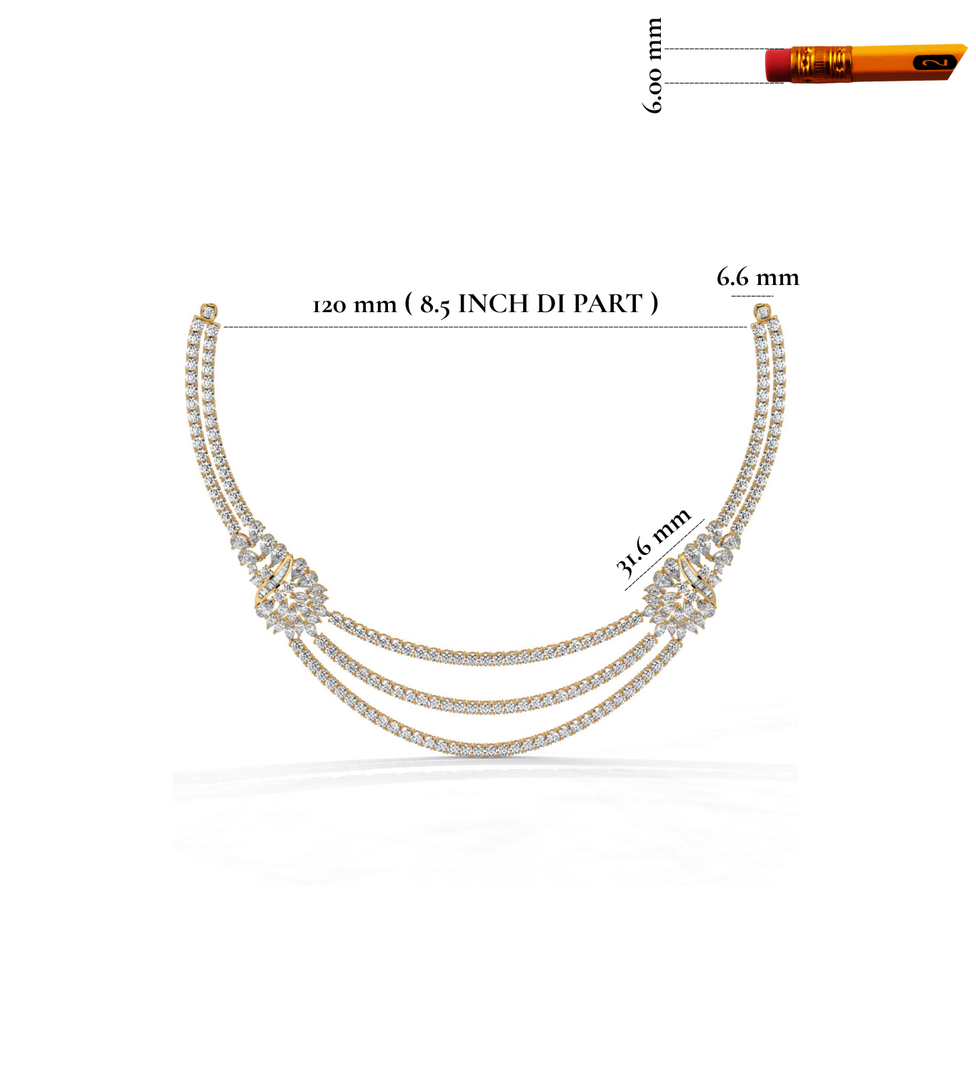 The Triluxe Diamond Draped Necklace is the epitome of refined glamour, designed to flow gracefully like a cascade of light. Featuring three elegant diamond-lined layers that drape beautifully around the neckline, this masterpiece exudes sophistication and timeless charm. Each diamond is meticulously set to create a radiant glow, ensuring brilliance with every movement.