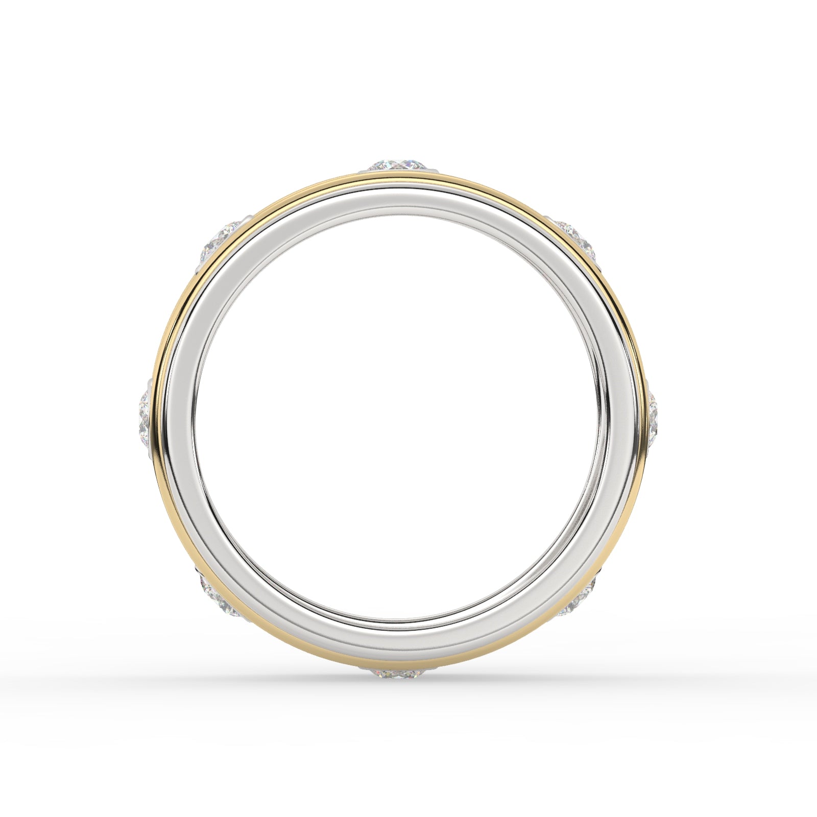 The contrast of two-tone gold enhances the brilliance of each meticulously placed diamond, creating a radiant sparkle that captivates from every angle. Whether worn alone or stacked with other rings, this eternity band is a versatile and timeless treasure.
